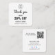 A minimalist black and white QR code discount card for a professional business to use as a promotional tool to develop customer loyalty. Replace the image with a square photo of your business logo. You can change the font, font colour, font size, letter spacing, background colour and colour of the Thank You graphic using the Design Tool. You can also change the social media icons so they are relevant to your business. The simple modern elegant design is yours to customise as you wish.
