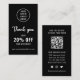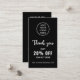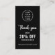 A vertical minimalist custom business logo black and white QR code discount card for a professional business to use as a promotional tool to develop customer loyalty. Replace the image with a square photo of your logo. You can change the font, font colour, font size, letter spacing, background colour, colour of the Thank you graphic and reposition the text using the Design Tool. You can also change the social media icons so they are relevant to your business. The simple modern elegant design is yours to customise as you wish.