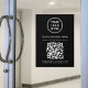 Modern black window cling sign for your business with your QR code for customers to scan to view your products, services, prices or other information. Add your logo, business name, QR code, phone number and street address in simple white typography.