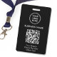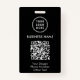 Modern and professional black ID badge for your business or event featuring your logo and QR code. Add your business or event name and other information in simple white typography.