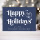 Business corporate Christmas card for customers, employees, affiliates, etc., with "Happy Holidays" written in stylish white serif typography against a blue background. Add your logo and seasonal greeting (thank you, from all of us, etc.) and company name. On the back, input your website address to create a scannable QR code.