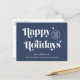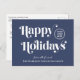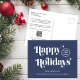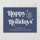 Blue corporate Christmas postcard for your business customers, employees, affiliates, etc., featuring "Happy Holidays" in stylish serif typography, your company logo and name in simple modern white typography. On the back, add a personalised seasonal message of appreciation and thanks and input your website address to create a QR code that customers can scan to access your online platforms.