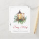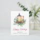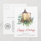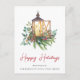 Corporate holiday postcard featuring a watercolor of a Christmas candle lantern in an arrangement of seasonal pines, eucalyptus berries and greenery and "Happy Holidays" written in a contemporary red script. On the back, add a message of customer appreciation, upload your business logo and input your website address to automatically create a QR code that customers can scan to connect to your online platforms.