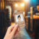 Light wooden background white framed photo. Employee and company info. Ready for you to upload your employee photo, your company logo, and edit your business information.