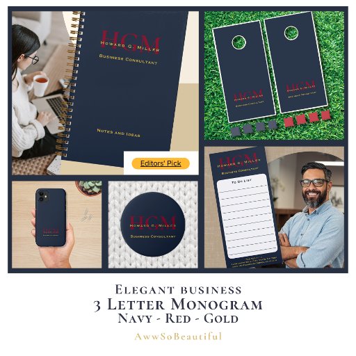For al professional look, all around the office, create your own personalised office and desk accessories by adding your own business logo and personalising them with each of your employee names and business department. The monogram design, made for businesses, is a professional, simple and modern 3 letter monogram with burgundy red typography on navy blue background. Personalised and customised with business and or person’s name in gold typography and navy blue shadow for depth, contrast and increased legibility. Versatile design, easy to customise for any type of business, profession or industry, by simply adding your professional title, type of business or company tag line. Transfer to other products effortlessly, to make your own promotional products too.