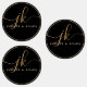 Business Monogram Script Logo Black Gold Waterproof Labels. Elegant business waterproof product labels featuring a monogram initials logo in fancy calligraphy script with swashes and your custom text in your choice of all colours (shown in gold on black). CHANGES: Change any text font style, colour, size, spacing and placement or background and circle frame colour in EDIT to coordinate with your brand. ASSISTANCE: For help with design modification or personalisation or if you would like coordinating items, contact the designer BEFORE ORDERING via the Zazzle Chat MESSAGE tab or email makeitaboutyoustore@gmail.com.