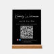Chic black acrylic sign featuring your name in a stylish white signature script and business in modern white typography. Input your website address to create a scannable QR code for customers and clients to see your products, services, hours, etc. Add your instagram and facebook user ids for customers to follow you on social media.