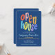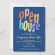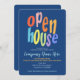 A business or corporate open house invitation. This fabulous invitation features bold modern typography on a blue background. Easy to personalise with your own open house event or launch celebration details.