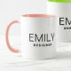 Personalised Business Promotional Add Your Name Two-Tone Coffee Mug in pink. Take your side gig to the next level with this customised business coffee mug. Simple modern classic black typography. Add your name and your company name or title to this mug and make an impact. Perfect for business meetings, for around the office, events or promotional giveaways. Part of a collection. Design featured on Zazzle's Holiday Lookbook. ©Marisu Valencia
