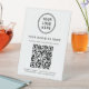 Modern table top pedestal sign for your business with your QR code for customers to scan to make a payment, for a list of your products, services and prices, for appointments, to register, etc. Upload your logo and QR code and add your business name, phone number, street address or other information in simple typography. Unlock the potential for increased customer engagement and seamlessly bridge the gap between offline and online experiences, allowing your business to thrive in the digital era.