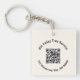 Black and white key ring with QR code and two lines of curved text. Advertise a business with name that curves around the top and address at the bottom on off-white background. This key ring has the design on one side only.