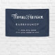 Modern blue promotional banner sign for your business featuring your company name or brand showcased in a stylish white signature script and your customised text in simple white lettering.