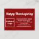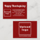 Happy Thanksgiving! Holiday to celebrate this November to thank for the blessings that we received. It is also one of the holidays to advertise your business. Enclosure card that you can customise to put your business brand and with Thanksgiving greeting. Customise it and use it to greet your customers or clients this Thanksgiving and as marketing material to advertise your business or to promote your brand name. You can also use it as accessory of packaging material of your product. Customisable enclosure card that you can use to build brand name awareness. Design colours are white texts on red background. To customise this enclosure card, upload your business logo, type your business name, address, phone number, e-mail and website or your business social media page. Please check the appearance on front and back sides after uploading logo and typing texts. If the appearance is pleasing to you, you can place your order now. If you need to resize and move the logo and texts to fit on this enclosure card or on the size that you will choose, please change in the design tool. You can also change the background colour, font colour and font style in the design tool. Happy Thanksgiving! Wishing you more sales this holiday.