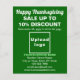 Happy Thanksgiving! Holiday to celebrate this November to thank for the blessings that we received. It is also one of the holidays to advertise your business. Customisable flyer with Thanksgiving sale, your business name and other information of your business, a marketing material that you can use to attract more customers. Customise it and distribute it to attract more customers to buy your products or clients to like your services. Design colours are light green and white texts on green background. To customise this flyer, specify the percent discount that you will offer and sale dates. Upload also your business logo, type your business name, address, phone number, e-mail and website or your business social media page. Please check the appearance on front and back sides after typing texts and uploading logo. If the appearance is pleasing to you, you can place your order now. If you need to resize and move the texts and logo to fit on this flyer or on the size that you will choose, please change in the design tool. You can also change the background colour, font colour and font style in the design tool. Happy Thanksgiving! Wishing you more sales this holiday.