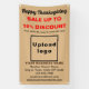 Happy Thanksgiving! Holiday to celebrate this November to thank for the blessings that we received. It is also one of the holidays to advertise your business. Customisable banner with Thanksgiving Sale, your business name and other information. Banner that you can use as marketing material to attract more customers. Customise it and display it to convince more customers to buy your products or clients to like your services. Design colours are black, dark brown and red texts on light brown background. Contents are Happy Thanksgiving greeting, sale texts with percent discount that you will offer, sale dates, your business name, logo, address, phone number, e-mail and website or your business social media page. Please check the appearance after uploading logo and typing texts. If the appearance is pleasing to you, you can place your order now. If you need to resize and move the logo and texts to fit on this banner or on the size that you will choose, please change in the design tool. You can also change the background colour, font colour and font style in the design tool. Happy Thanksgiving! Wishing you more sales this holiday.
