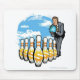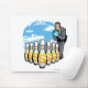 Businessman bowling a globe towards money pins mouse pad