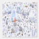 A cute and beautifully detailed watercolor-painted bustling mountain alpine ski village with snowy mountains, chalets and shopkeepers, skiers skiing, visitors building snowmen, villagers gathering, children playing, dogs barking and Christmas bells a'ringing in this illustrated winter holiday pattern.