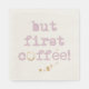 NewParkLane - Paper Napkins, with fun quote 'But first coffee!' in an old fashioned typewriter font in lavender / purple, with the letter 'o' being a coffee stain.