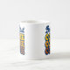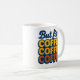The warm color palette of yellow, orange, and brown stacked on a dark blue background evokes a nostalgic 70s diner or retro coffee shop vibe. This mug is a perfect gift for anyone who loves vintage style, bold colors, or simply prioritizes caffeine above all else.
