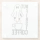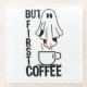 This image features a playful and whimsical design with the phrase "BUT FIRST COFFEE" written vertically on the left side. The text is in a bold, distressed font, adding a rustic charm. To the right of the text, there is a cute ghost illustration hovering above a steaming cup of coffee. The ghost appears to be enjoying the aroma of the coffee, with steam lines rising from the cup, suggesting a warm and inviting beverage. This image cleverly combines a spooky Halloween theme with a relatable morning routine, making it both fun and relevant for coffee lovers who appreciate a touch of humour. ☕👻