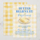 This trendy design features a charming butter illustration on a plate, a soft yellow gingham background, and a delicate bow detail for a sweet and stylish look. Perfect for a modern, playful baby shower with a unique food-inspired theme.