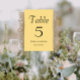 Guide your wedding reception guests to their table with this simple style table number card that features black, stylised lettering on a trendy, butter yellow colour background. Design is on each side of card. Edit your card to change table number, wedding couple's names and date. Order cards separately for each table number.