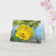 Here is a fine art photography blank note card with one yellow buttercup flower blooming at the edge of the pond on a summer day. The reflections of green leaves, white clouds and blue sky add to the lovely artistic, impressionistic composition.