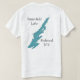 A loon and babies on the lake in a backdrop of green. On the back side is a map of Butterfield Lake.