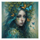 A woman with flowing blue hair is surrounded by butterflies and leaves, creating a mystical and ethereal atmosphere. Her serene expression and the vibrant colours convey a sense of harmony with nature.