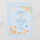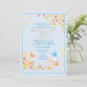 A modern invitation with a blue background featuring abstract daisies and butterflies. This versatile design can be used not only for baby showers but birthdays too.
