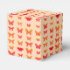 An array of speckled butterflies in shades of orange, gold and coral pink on a pastel orange background