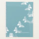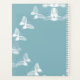 Butterflies flying up into a spiral shaped pattern on a blue-green background.