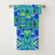Towel set in a digital batik pattern of large butterflies on an ornate, arabesque medallion background, in shades of cobalt blue, turquoise and jade green