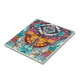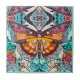 Ceramic tile in a digital batik large butterfly on an ornate, arabesque medallion background, in shades of amber, orange, aqua and beige