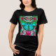 Tee in a digital batik pattern of large butterflies on an ornate, arabesque medallion background, in shades of turquoise and deep rose pink