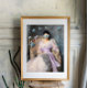 Vintage painting remix of a woman wearing a vintage white dress with pastel blue butterflies.