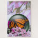 This puzzle image features a beautiful scene of butterflies and flowers. A large, vibrant monarch butterfly with striking orange and black wings is the central focus, set against a backdrop of soft pink flowers. Surrounding the monarch are other butterflies, including a delicate pink butterfly in the background. The overall composition is enhanced with a glossy, spherical effect, giving the image a dreamy, ethereal quality.