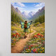 This whimsical illustration features a butterfly winged fairy hiking a mountain trail, surrounded by colorful wildflowers and red toadstool mushrooms. The storybook-style art captures a love for nature, adventure, and magical daydreams. This poster art is perfect for those who love fairycore style, cottagecore art, and fairytale designs that feel nostalgic and magical. Add a touch of fairytale trail magic to your space with this unique poster wall art.
