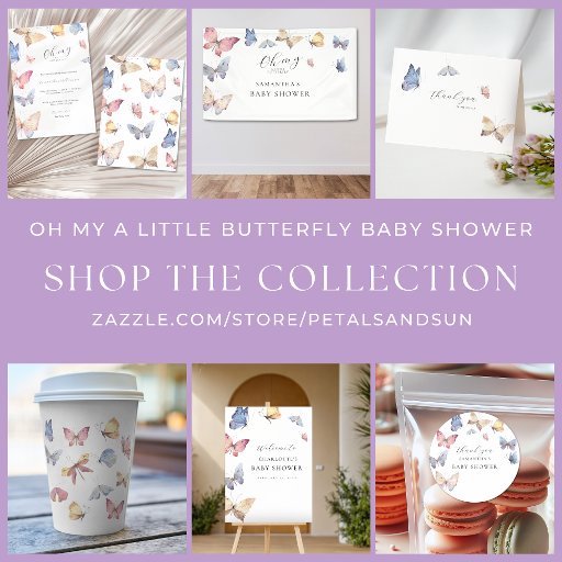 The phrase “Oh my, a little butterfly” is highlighted in a graceful modern script font, perfectly complementing the soft, playful palette of pink, beige, sunny yellow, magenta, and royal blue. This invitation blends modern elegance with a touch of fairytale whimsy — ideal for a spring, garden, or butterfly-inspired baby shower.
