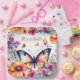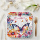 A pretty butterfly surrounded by pink, blue, orange and purple flowers watercolor illustration girl's baby shower personalised paper plates.