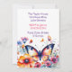 A pretty butterfly surrounded by pink and purple flowers watercolor illustration girl's birthday party invitations.