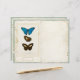 Vintage junk journal page with blue and brown butterfly scientific illustration on the front and brown butterfly illustration on the back. French drawings and annotations. Teal paisley background and parchment pages with gold labels, tape and stitching details in the centre. Fold in half to make journal pages.