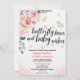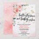 Butterfly Kisses and Baby Wishes is a slightly whimsical and very sweet style featuring nine faux gold butterflies, a pink rose floral arrangement with hints of sweet small white flowers and soft green-toned eucalyptus leaves, and some black modern calligraphy text.