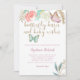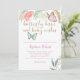 Sweet baby shower invitation template card featuring watercolor pink and mint butterfly with faux gold embellishments. The text at the top says "butterfly kisses and baby wishes." There are flowers at the top. Customise this product by adding your party information.