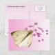 This postcard features the exquisite cabbage butterfly (Pieris rapae). She has stopped flitting around the garden long enough to perch on a verbena blossom. She has a black body which does not show beneath her four white wings, each with a black dot at the centre. The two upper wings have a black band at the tips. Her face is a pale green. Although she is a lovely, delicate creature, her caterpillars devour cabbages and other member of the brassica family of vegetables. The reverse has one tiny butterfly on a pale pink gradient background.