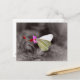 A beautiful black and white photograph postcard with selective colouring on the yellowish white butterfly kissing a pretty pink wildflower.
