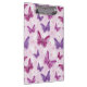 Seamless pattern of flying butterflies in shades of pinks and purples with white flowers over pale pink background. © and ® Bigstock® - All Rights Reserved.
