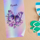 A holographic background in pink, purple and mint green. Decorated with a purple butterfly, pink and purple flowers. Personalise and add your name.