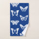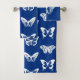 Towel set in digital sketches of assorted butterflies adapted from vintage illustrations, and digitally coloured - white on a deep cobalt blue background