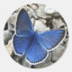 Beautiful sticker with blue butterfly resting on rocks.